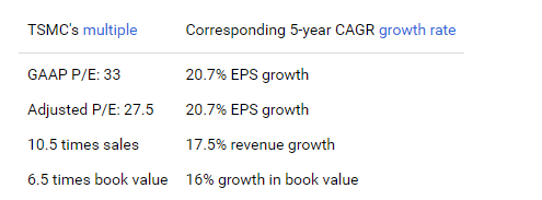 台积电是市场上最便宜的人工智能股票之一,尽管增长速度很快,但市盈率却“适中”。如下表所示,价值和增长的结合非常引人注目。
