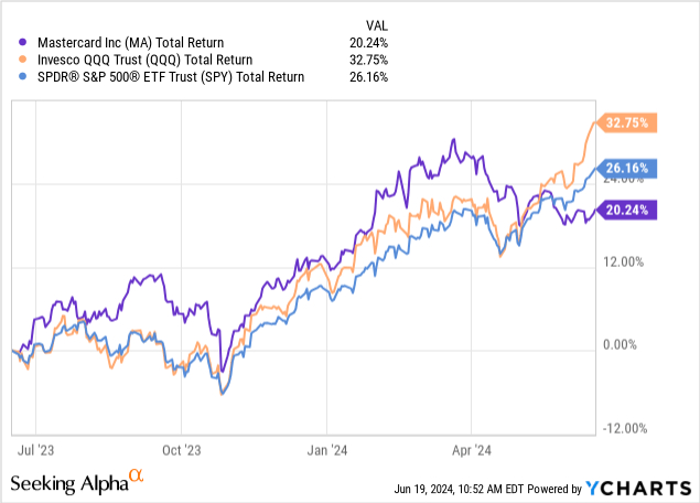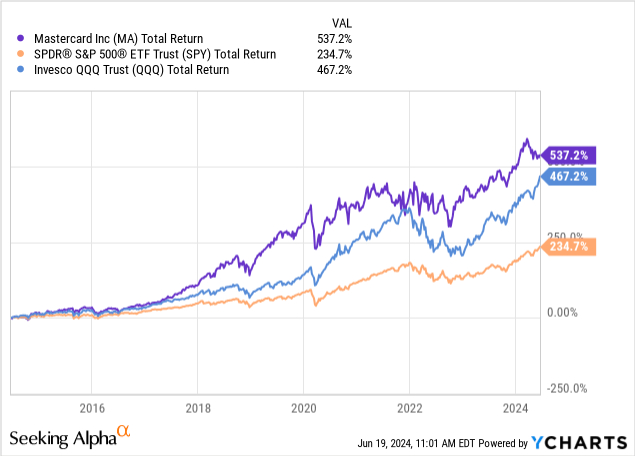 不过,12个月内20%的回报率也没什么可抱怨的。如果我们退一步来看,万事达卡在过去十年的表现仍然优于纳斯达克100指数和标准普尔500指数。
