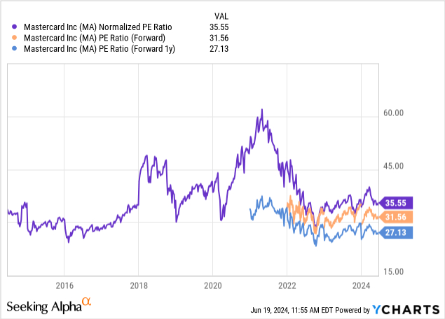 万事达卡目前的估值处于历史低位,市盈率比其5年平均水平低约15%。Visa的市盈率也有类似的折价。