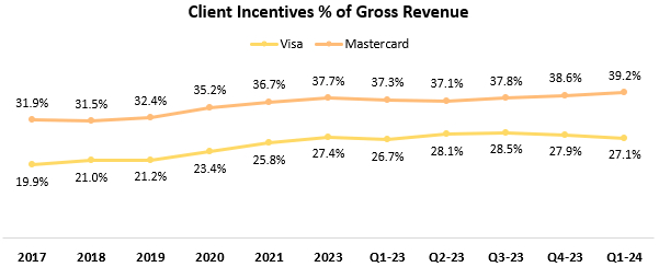 投资者理解的第一个关键指标是客户激励,其应以总收入的百分比来衡量。万事达卡和Visa都与其客户(通常是信用卡发行商)达成了协议,根据协议,万事达卡和Visa向客户支付回扣以激励客户使用其网络。一般来说,万事达卡和Visa提供的解决方案基本相同,因此大部分竞争都归结于财务激励。