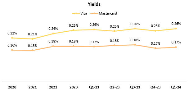 另一个需要考虑的关键指标是收益率。收益率反映了Visa和万事达卡每笔付款产生的支付处理收入。例如,万事达卡在2024年第一季度促成了2.3万亿美元的总交易量,其支付网络收入为39亿美元,收益率为0.17%。