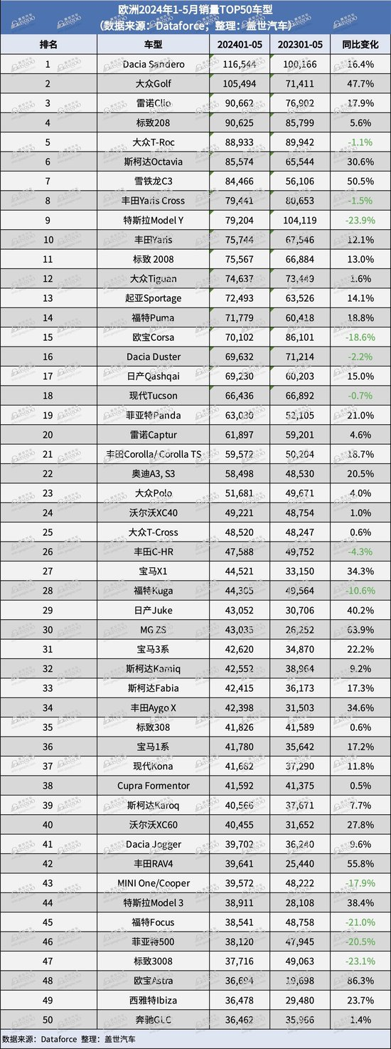 就Dataforce的初步数据来看,大众T-Roc是5月份欧洲最畅销的车型,同比增幅超过12%。大众Golf紧随其后,5月销量同比劲增28%。Dacia Sandero排名第三,销量为18,676辆,比2023年5月下跌10%。