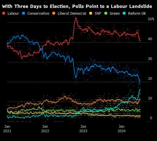 业内对多份民调的汇总数据显示,工党目前领先保守党21个百分点,这意味着工党势将赢得比前首相布莱尔1997年获胜时更大的优势,从而令现任工党领袖斯塔默得以入主唐宁街10号。