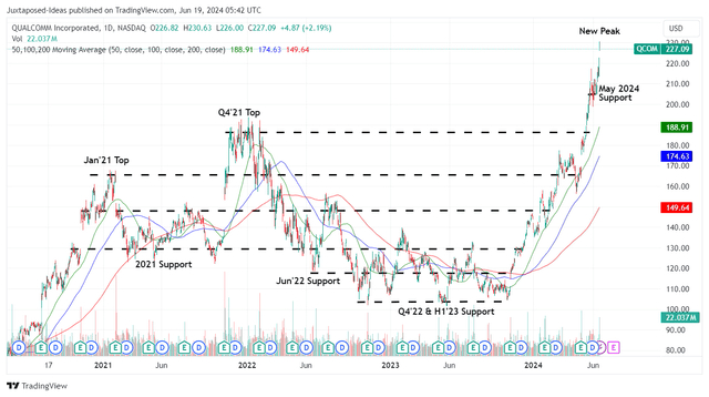 目前,高通自2023年上半年触底以来已经录得令人印象深刻的+112.2%的复苏,同时创下220美元的新高,并在撰写本文时摆脱了50/100/200天移动平均线。
