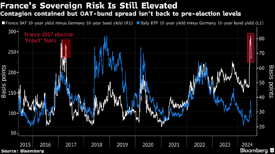 不过CAC 40指数仍比6月9日投票前的水平低约4%。投资者持有法国国债相对德国国债的溢价不到70个基点,低于宣布提前大选后的86个基点高峰,但远高于6月初50个基点的水平。