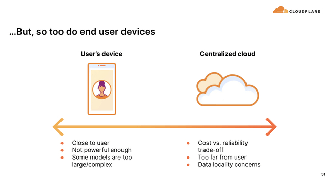 在推动设备上的AI推理方面,最大的问题是缺乏复杂AI模型的能力。解决方案是利用Cloudflare的分布式网络来提供更接近最终用户的规模。