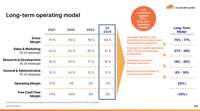 该公司设定的长期目标是营业利润率达到20%以上,大约是目前11%的两倍。该股交易价格为2024年每股收益目标0.61美元的141倍,即使营业利润率翻倍,当公司最终专注于盈利能力时,每股收益也会翻倍,但Cloudflare的价格仍然非常昂贵。
