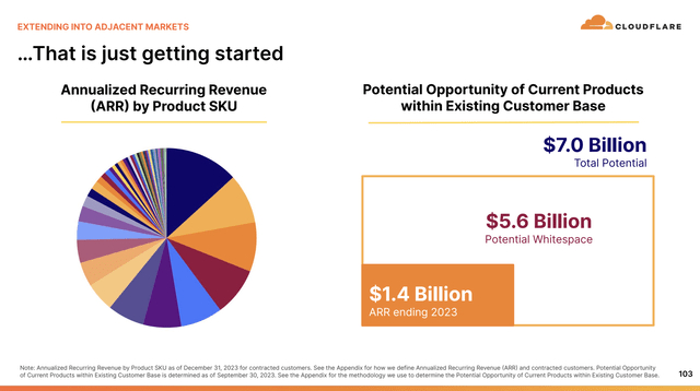 该公司拥有庞大的TAM,预计今年将达到1760亿美元,到2027年将达到2220亿美元,其中大部分增长可能归功于人工智能。虽然TAM数字可能永远是天方夜谭,一家公司几乎不可能抢占10%的市场份额,但Cloudflare实际上列出了仅从现有客户那里获得的70亿美元市场机会,而到2024年初,总ARR仅为14亿美元。