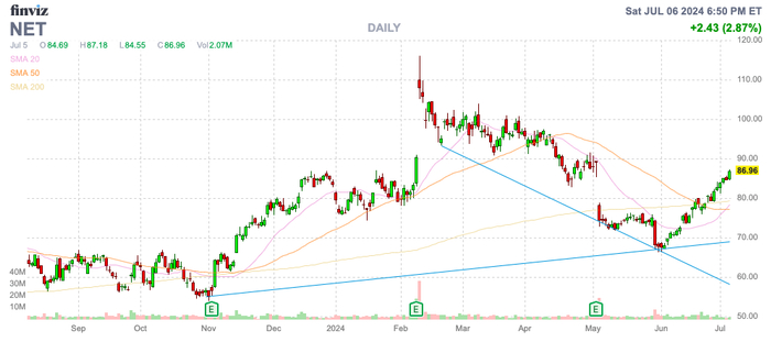 该股已飙升至87美元,市值接近300亿美元。Cloudflare的估值接近不可持续的20倍销售目标。