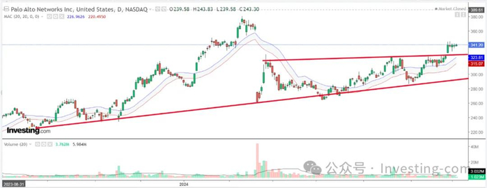 Palo Alto Networks是全球网络安全领域的领导者,上周五收于342.09美元,略低于2024年2月9日创下的380.84美元的历史高位,市值为1105亿美元。