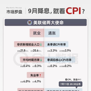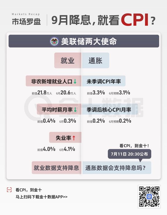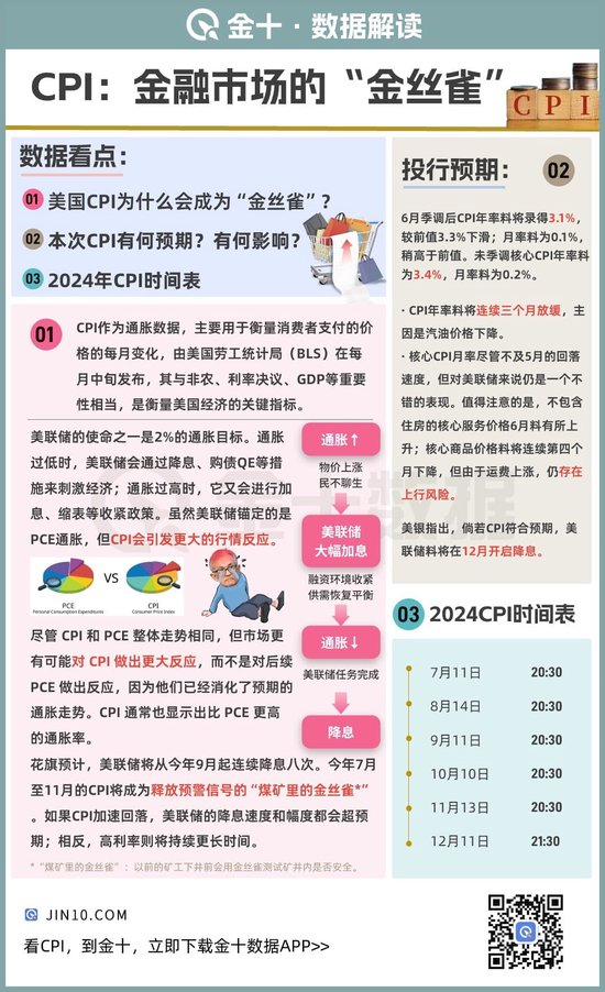 7月11日20:30,美国将公布最新的CPI通胀数据。在美联储主席鲍威尔连续两天出席听证会,并表示通胀进一步取得进展之后,最新的CPI将对9月降息的可能性产生重大影响。