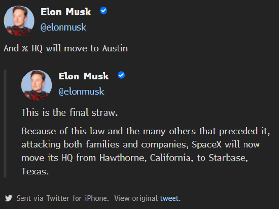 埃隆·马斯克表示X和SpaceX的总部都将迁往德州,这位亿万富翁的理由是对这两家公司目前所在的加州的法律感到不满。
