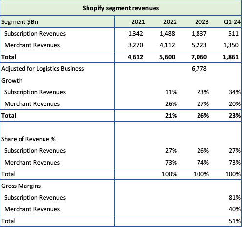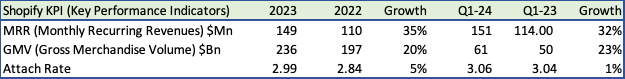 订阅收入是其业务的关键,毛利率为81%;2024年第一季度,订阅收入增长速度为34%,远高于商户收入20%的增长速度。然而,订阅收入仍只占总收入的27%,但随着Shopify增加通常采用每月订阅Shopify Plus产品的企业客户,订阅收入将占更大份额。2024年第一季度表现更好-由于去年价格上涨,订阅、商户和总毛利率均比上年提高了3个百分点,从而带来了更高的收入和利润率。