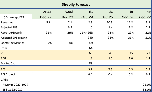 Shopify的收入在未来4年内应能以22%的复合年增长率增长,调整后收益将以32%的速度增长。该公司已经放缓了股权激励的增长速度,过去两年几乎没有出现股权稀释,这表明该公司非常重视营业利润。在32%的收益增长下,65的市盈率在两年内降至35,PEG比率也降至可控的1。
