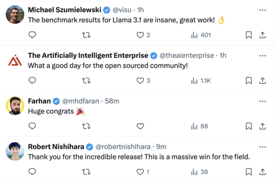 大部分网友对Meta表示祝贺,认为Llama 3.1是伟大的杰作,是开源社区的胜利。