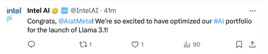 英特尔首先发来贺电:“恭喜MetaAI!我们很激动能用Llama 3.1的发布来优化我们的AI产品组合。”