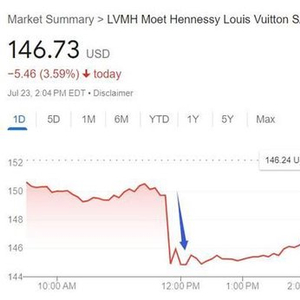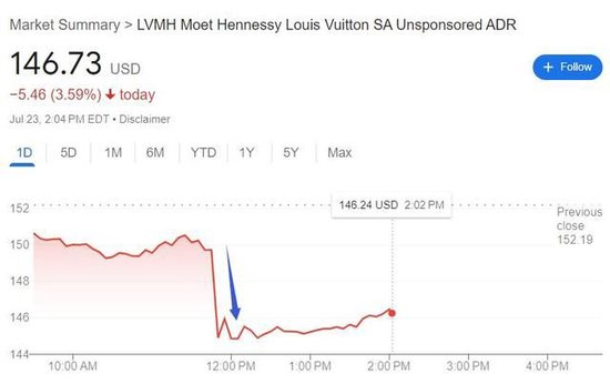 财报公布后,LVMH美股盘中跌幅迅速扩大,美股早盘尾声时,日内跌幅短短五分钟左右从逾1.6%扩大到4%以上,盘中刷新日低时,日内跌5.1%。