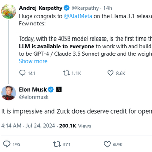 随后,马斯克罕见地向扎克伯格致敬。马斯克在回应特斯拉前AI总监Andrej Karpathy关于该模型的帖子时表示:“这令人印象深刻,扎克(伯格)的开源决定确实值得赞扬。”