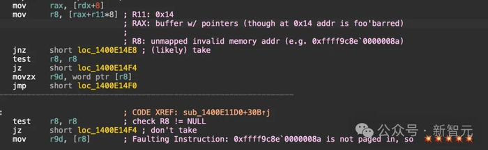 首先,他查看了故障位置——mov r9d,[r8]。其中R8属于未映射的地址。