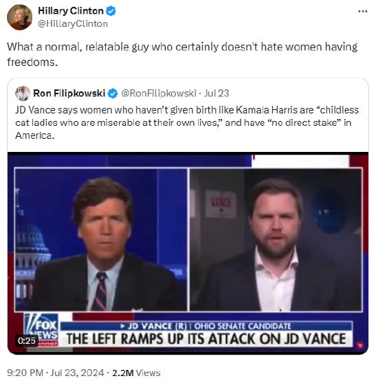 希拉里·克林顿 (Hillary Clinton) 在 X 上讽刺地写道:“真是一个正常、平易近人的男人,他肯定不讨厌女性拥有自由。”