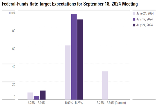 市场几乎完全定价美联储将在7月会议上维持利率不变,投资者已经在展望9月或12月的降息。截至周三,根据芝商所的美联储观察工具,债券期货市场定价显示九月降息25个基点的可能性约为90%。