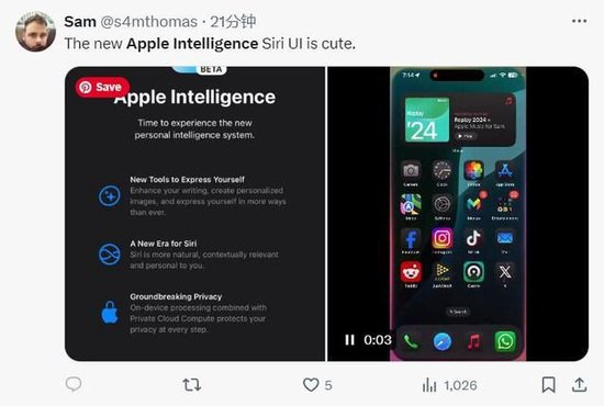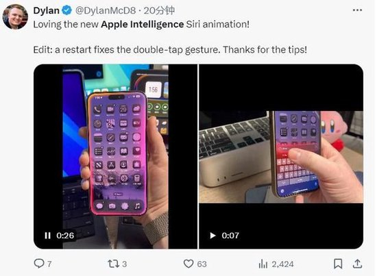 有网友称,喜欢新的Apple Intelligence Siri 动画,还附上短视频展示重新启动后可修复双击手势,感谢这个妙招。