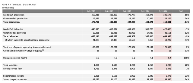 第二季度总产量同比下降14%至41.08万辆,总交付量同比下降5%至44.4万辆。Model 3/Y交付量同比下降5%,而其他车型(S和X)同比增长12%。