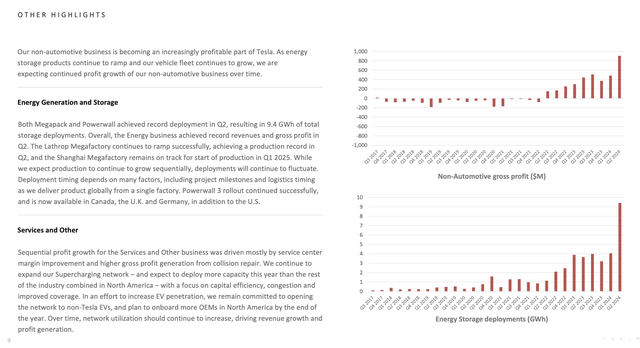 该公司指出,Megapack和Powerwall的部署量已达到创纪录的9.4 GWh。如上图所示,非汽车部门的毛利润也达到近10亿美元(而特斯拉的总毛利润为46亿美元),这一份额比收入更有意义。此外,该公司指出,能源部门仍有大量未完成订单。根据首席财务官Vaibhav Taneja在第二季度财报电话会议上的讲话: