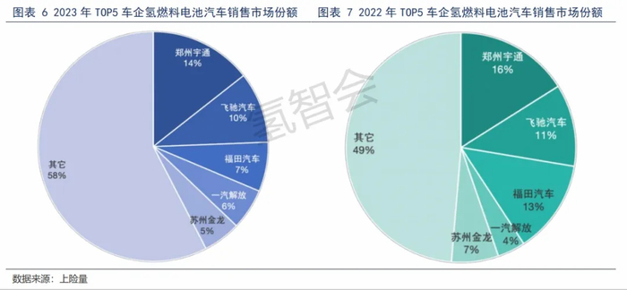 这样的趋势下,通过发力产品研发,一些企业也率先抢占高地。据氢智会报告,以市场份额计,2023年氢燃料电池汽车TOP5分别为郑州宇通、飞驰汽车、福田汽车、一汽解放、苏州金龙。