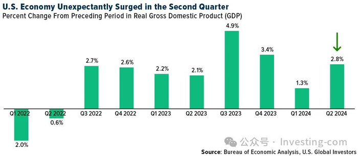 美国政治风云变幻之际,美国经济却发出了复杂的信号。一方面,第二季度国内生产总值(GDP)的增速达到了令人瞩目的2.8%,不仅超越了预期,增速还较第一季度翻倍。