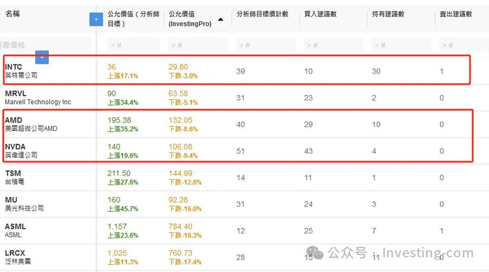 InvestingPro显示,分析师最看升AMD,然而股指模型认为当前三只芯片股都没有什么上升空间。