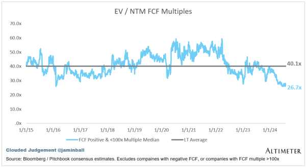 折线图显示了FCF倍数为>0倍和<100倍的所有公司的中位数。我创建了这个子集,以向公司展示 FCF 是相关估值指标的公司。