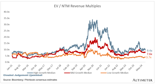 10 年期债券最近一直在下跌,自 2 月初以来首次跌破 4%。当时软件 NTM 收入倍数中位数约为 6 倍。今天约为 5 倍。有趣的是,随着利率下降(10 年期债券从 7 月初的 4.5% 降至 7 月底的 4.0%),倍数保持平稳。过去几年,人们一直在讨论利率和倍数之间的关系,以及它们之间的反比关系。然而,利率只是一个变量。今天,市场似乎更担心商业基本面/增长。关于经济可能放缓,有许多“煤矿里的金丝雀”。消费似乎正在放缓。