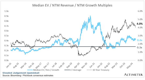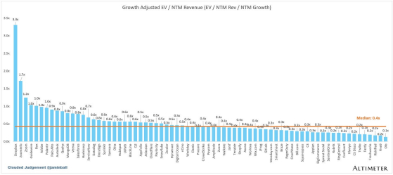 下图显示了EV / NTM收入倍数除以NTM共识增长预期。因此,一家以 20 倍 NTM 收入交易的公司预计将增长 100%,交易价格为 0.2 倍。这张图的目的是显示每只股票相对于其增长预期的相对便宜/昂贵程度