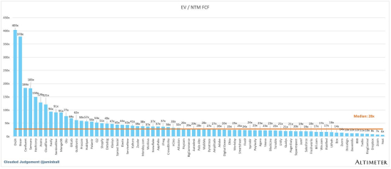 SaaS 企业的估值通常是以其收入的倍数为基础的,在大多数情况下是未来 12 个月的预计收入。收入倍数是一种速记估值框架。鉴于大多数软件公司都不盈利,或不能产生有意义的 FCF,因此这是比较整个行业的唯一标准。即使是 DCF 也充满了长期假设。SaaS 的承诺是,早期的增长会带来成熟期的利润。下面显示的倍数是根据企业价值(市值+债务-现金)/NTM收入计算得出的。