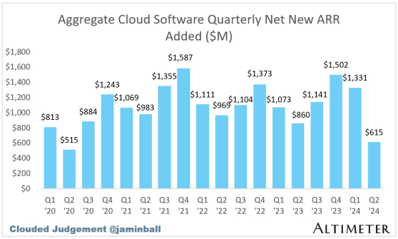 然后是更广泛的软件领域。我们仍处于盈利初期(第 2 周)。但是 - 在 16 家公布第三季度(截至 2024 年 9 月的季度)业绩预期的公司中,有 9 家公司的业绩低于预期。56%!如果我们看看迄今为止已公布第二季度业绩的一篮子公司,并比较它们在第二季度与前几个季度增加的总净新 ARR(下图),你会发现第二季度的表现相当糟糕(同样,仅针对迄今为止已公布业绩的公司)