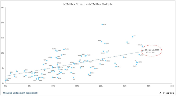 EV / NTM Rev 倍数与 NTM Rev 增长的散点图