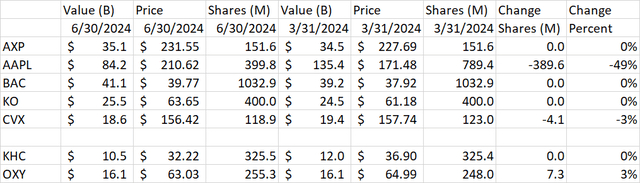 通常,伯克希尔的季度报告只反映渐进式变化,没有重大新闻项目。但2024 年第二季度的情况并非如此,我们看到伯克希尔出售了其最大股票头寸苹果 ( AAPL ) 的近一半。在第一季度,伯克希尔已经从 9.05 亿股减持至 7.9 亿股,减持幅度已达 13%,而在第二季度,伯克希尔又出售了惊人的 3.9 亿股,将头寸削减了 49%,至 4 亿股。