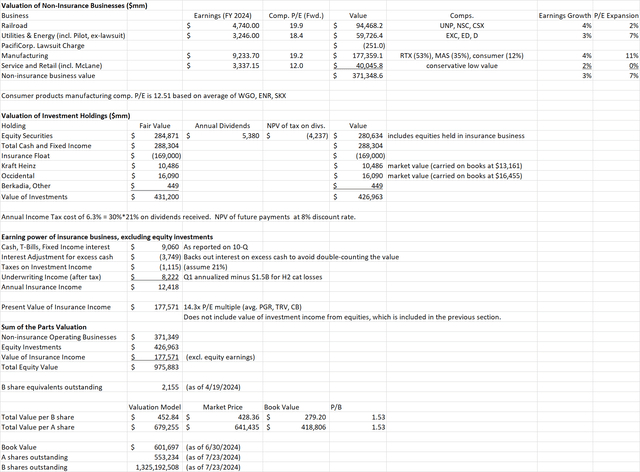 分析师更新了分部总和模型,以考虑伯克希尔的过剩现金。以前,现金和保险浮动资金大致相等,将它们都视为保险业务中的营运资本。保险业务的估值基于其产生承保和投资收入的能力,按同业倍数计算。