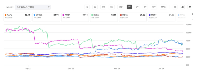 问题在于,相对于苹果的增长率,市盈率过高。无论从收入、EBITDA 还是 EPS 来看,苹果的百分比增长率都是个位数。大型市值公司的同行增长率强劲,达到两位数甚至更高。同行比较页面上的 PEG 比率显示,苹果的 PEG 比率超过 3,但其他大多数大型市值公司的 PEG 比率低于 1。
