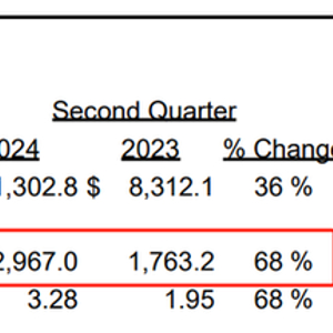 利润:二季度净利润同比增长68%至29.7亿美元,调整后每股收益3.92美元(Non-GAAP),较去年同期的2.11美元增长86%,预期为2.6美元。