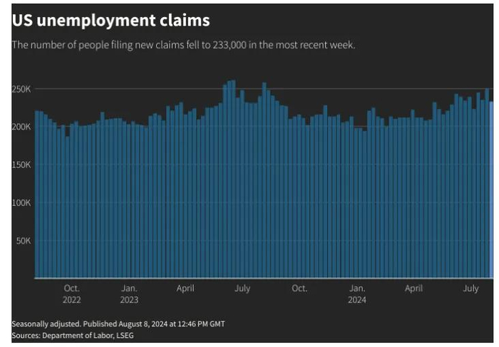 美国劳工部周四公布的数据显示,8月3日当周初请失业金人数经季节调整后为23.3万人,减少了1.7万人,为约11个月来最大降幅。路透调查的经济学家此前预计,上周初请失业金人数为24万人。