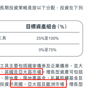 再比如宏利环球货币储蓄计划债券及其他固定收入资产大多数投资美国及亚洲市场,而非固定收入资产主要投资美国、欧洲和亚洲市场。