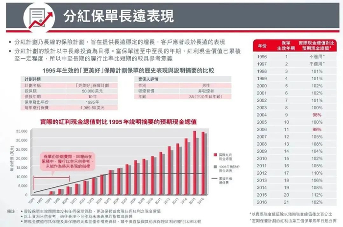 再比如保诚1995年生效的更美好保障计划,在20年的历史长河中分红实现率只有2年低于100%,分别是2004年的98%和2006年的99%。