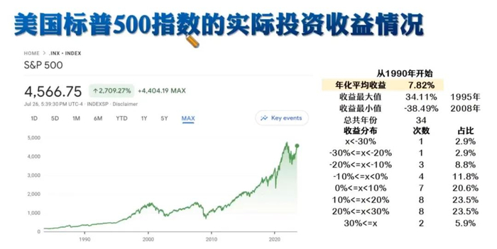我们再接着看美国标普500指数在过去30多年的实际投资收益率,如下图所示,基本上年化收益可以达到7.82%。