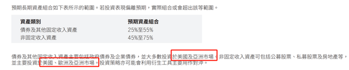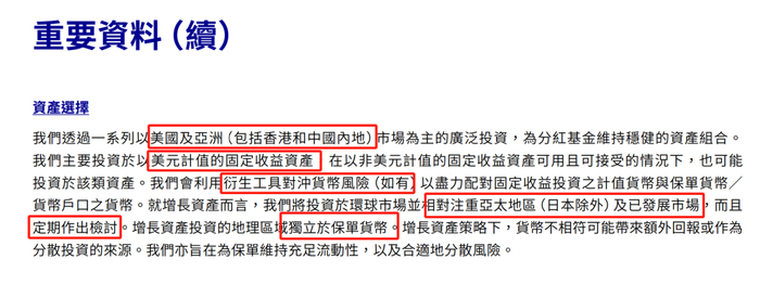 主要投资地区以美国和亚洲市场为主,固定收益资产主要以美元计值的固定资产为主,同时会用衍生工具对冲货币风险。