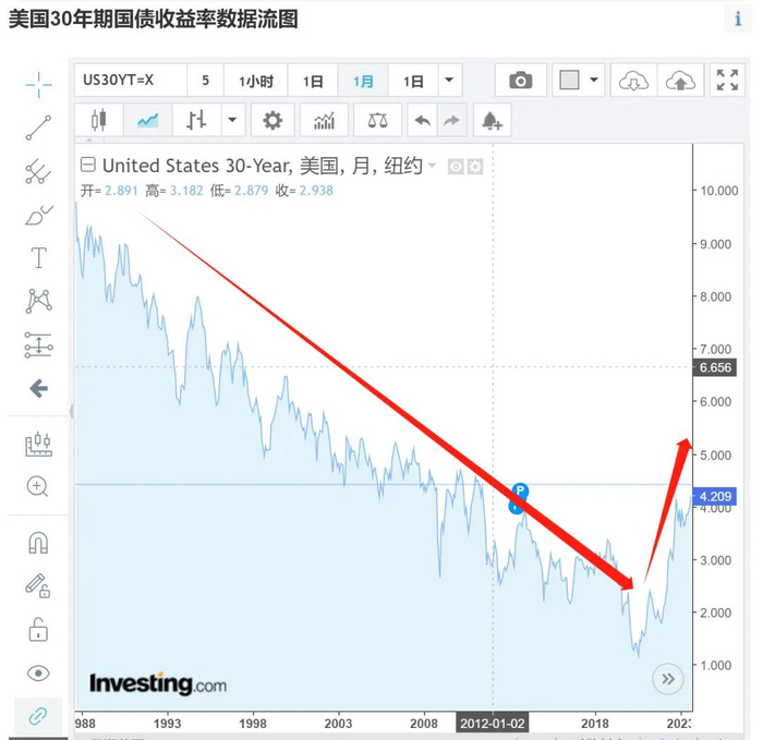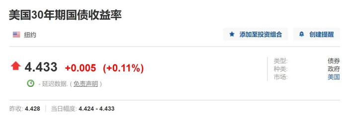 如上图所示,我刚查了下美国最新的30年期国债收益率飙升到了 4.433%,这意味着保险公司在此时买入30年国债持有到期,将获得差不多4.433%的年化回报。