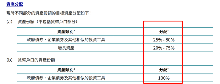 其中政府债券、企业债券及其他相似的投资工具占比从25%-80%灵活调配,增值资产(上市股票、私募股权、房地产、对冲基金等)占比从20%-75%灵活调配。