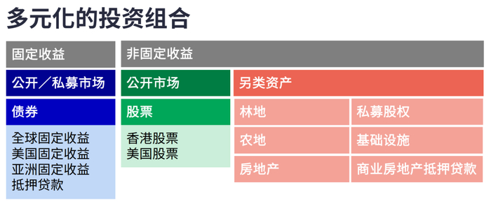 比如宏利多元化投资组合包含公开/私募市场、债券、香港股票、美国股票、林地、农地、房地产、私募股权、基础设施、商业房地产抵押贷款等另类资产。