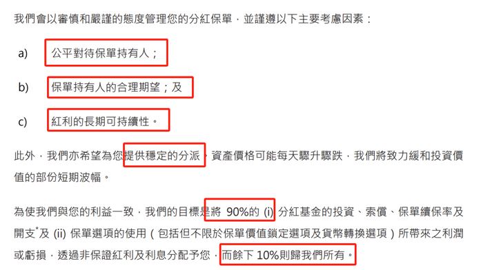 并且承诺将90%的利润(亏损)通过非保证红利和利息分配给保单持有人。